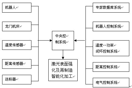 首先,在中央控系統(tǒng)輸入激光表面強(qiáng)化及再制造所要達(dá)到的效果,系統(tǒng)自動(dòng)從激光表面強(qiáng)化及再制造工藝參數(shù)數(shù)據(jù)庫[13]調(diào)出工藝參數(shù),然后通過中央控制系統(tǒng)發(fā)出指令給激光器、機(jī)器人系統(tǒng)、紅外測(cè)溫儀以及距離傳感器。機(jī)器人系統(tǒng)根據(jù)給出的指令調(diào)用程序,激光器輸出功率參數(shù),距離傳感器及紅外測(cè)溫儀實(shí)時(shí)監(jiān)控激光加工區(qū)的溫度以及加工距離。然后,距離傳感器以及紅外測(cè)溫儀根據(jù)實(shí)時(shí)監(jiān)測(cè)到的溫度及加工距離數(shù)據(jù),轉(zhuǎn)化成電信號(hào),再通過與中央控制系統(tǒng)的連接將信號(hào)傳輸給中央控制系統(tǒng);中央控制系統(tǒng)通過對(duì)溫度及加工距離信號(hào)數(shù)據(jù)的處理運(yùn)算,反饋出信息給激光器和機(jī)器人系統(tǒng),激光器和機(jī)器人根據(jù)反饋的信號(hào)調(diào)整功率輸出和加工距離,這樣就實(shí)現(xiàn)了溫度-功率閉環(huán)控制和加工距離智能化控制,實(shí)現(xiàn)了激光加工過程的智能化控制。