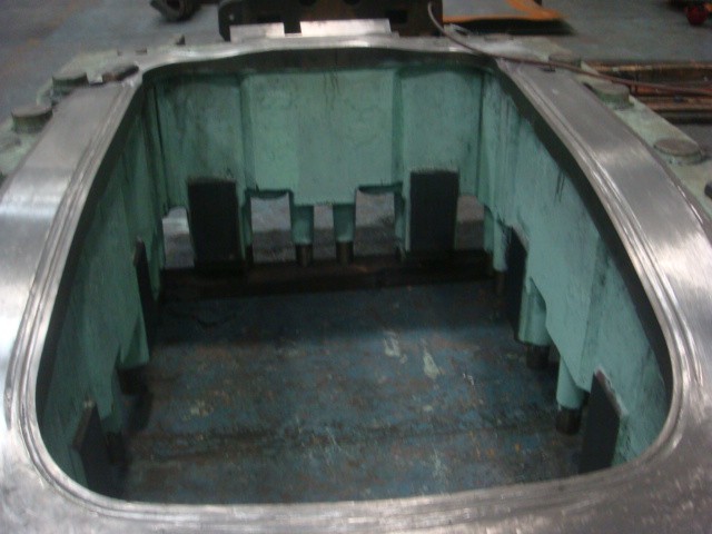 圖6汽車頂蓋拉延模,模具為Mo-Cr合金鑄鐵汽車頂蓋拉深模,激光處理前表面硬度為HRC40-45.由于拉深模工作表面硬度不夠,其工作表面易于工件產(chǎn)生粘著磨損,導(dǎo)致沖壓件被拉傷,生產(chǎn)過程中需要花費(fèi)大量時(shí)間對(duì)模具工作型面進(jìn)行推磨拋光,在線維修率達(dá)10%,經(jīng)激光表面強(qiáng)化后,模具表面硬度可提高到HRC58-62,處理后硬化層深度約為0.6-0.8mm,激光處理后模具使用壽命提高2-3倍,一次修磨拋光后的沖壓零件數(shù)已由原來300~500件提高到1000件以上,且激光淬火后的工件表面光亮,沒有任何氧化,后續(xù)機(jī)加工量非常小,大大節(jié)約加工時(shí)間和成本。