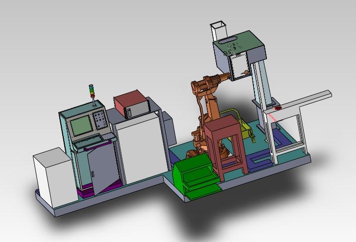 主要設(shè)備有ABB2400機器人,IPG500W光纖激光器,SR-500W切割頭,XY軸二維滑臺,PLC控制柜,冷水機,切割頭立柱及激光防護罩,工件上料預(yù)定位夾具,機器人定位氣爪,工件檢具,工件下料臺。系統(tǒng)整體結(jié)構(gòu)如下圖所示。