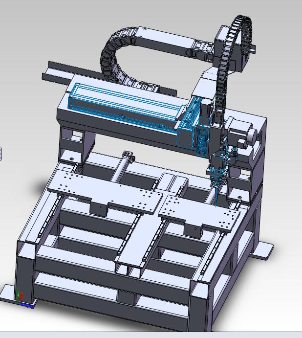 系統(tǒng)采用雙工位焊接模式,一個工位上料后進行焊接,另個工位可以同時上料并等待焊接。放工件在焊接工作臺上,按下啟動按鈕,工件自動夾緊,工作臺移動到焊接區(qū)內(nèi),焊接頭在XYZ三軸滑臺模組驅(qū)動下作平面XY方向焊接,Z軸可調(diào)節(jié)焊接焦距高度。焊接完成后工作臺退出。在動作流程中工件的夾緊,工作臺的移動,焊接頭的運動全部由PLC控制完成。操作工只要在觸摸屏上選好要加工零件的種類,PLC自動會調(diào)取相應(yīng)零件的加工G代碼及焊接速度和功率。軸的運動控制功能都可在觸摸屏上完成。