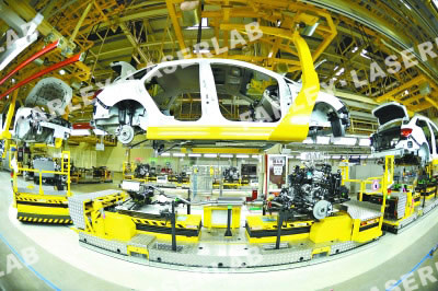 總裝車間,流水線上進行汽車底盤和車身安裝