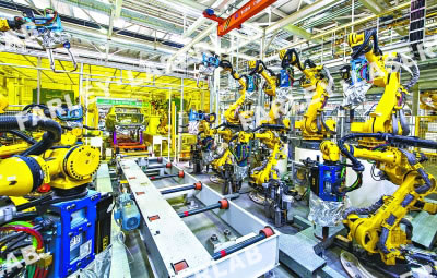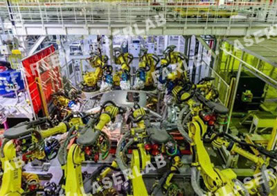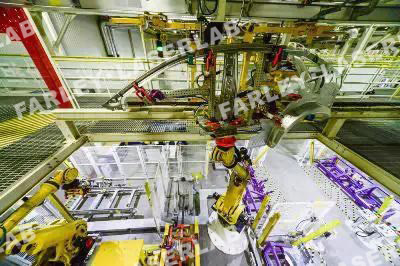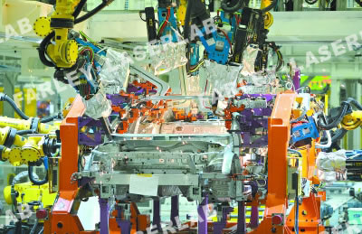 在車身車間,機器人正在進行總拼增焊工序,該車間擁有452臺機器人,自動化率高達97%