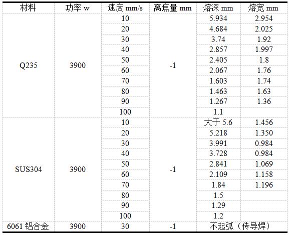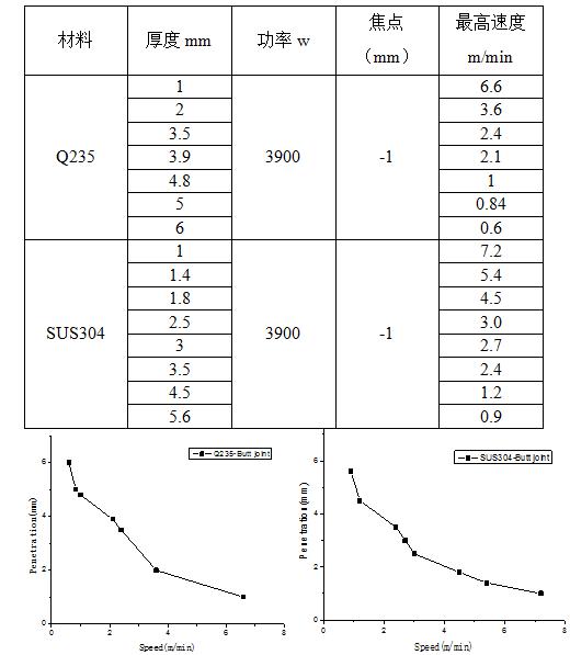從圖2可以看出,4000w半導(dǎo)體激光器焊接Q235與SUS304兩類(lèi)材料時(shí),1mm板焊接速度達(dá)6m以上,最大熔深達(dá)6mm,且同厚度下,不銹鋼焊接速度略高于碳鋼材料,材料厚度越小,差異越小,主要原因?yàn)閷?dǎo)熱系數(shù)的差異。