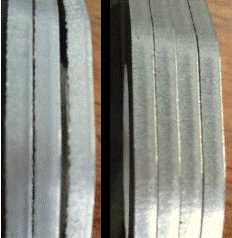 不得不說空氣切割鋁板優(yōu)勢更明顯,不僅速度得到了明顯提升,且不存在斷面發(fā)黑的問題,因為氧化鋁本身就是白色。了解光纖激光切割的人都知道,光纖激光器比二氧化碳激光器更適合切割鋁板,但是光纖激光使用氮?dú)馇懈钿X板很難避免刮渣的問題,這也一直困擾著很多用戶。然而,經(jīng)過實驗室工藝試驗使用空氣切割3mm以下鋁板使用新工藝方法可以做到幾乎不掛渣。這就是空氣帶來的神奇效果,氮?dú)馇懈钸_(dá)不到的效果。如下圖:左邊為氮?dú)馇懈?,右邊為空氣切?mm鋁板。
