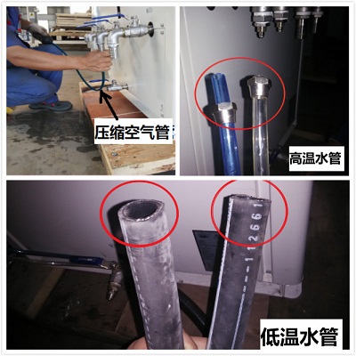 2、再盡量把水冷機管路里的水排空,把水管從水冷機上拆下來,使用<0.4MPa壓縮氣體(或氮氣)分別對4個進出水口進行通氣,直到將水冷機管路里的水基本上排出來為止,4個進出水口如下圖所示。