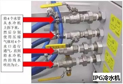 7、最后將激光器和水冷機外部其它的水管管路里的水放凈吹干(反復(fù)吹)。