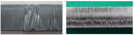 圖1.和圖2.示出了加工中厚板時經(jīng)常會遇見的切割斷面,這樣的切割不僅成品質(zhì)量受到質(zhì)疑,還會伴隨著過燒和嚴重的粘渣出現(xiàn),以致體現(xiàn)不出高價的激光加工機區(qū)別于其他切割手段的價值。