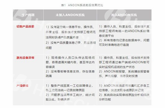 對比激光切割機(jī)加入ANDON系統(tǒng)前后效果(如表1所示)可發(fā)現(xiàn):未加入ANDON系統(tǒng)時,無共享信息平臺、現(xiàn)場無看板、操作人員口頭傳達(dá)現(xiàn)場內(nèi)容,無法及時發(fā)現(xiàn)停線原因等一系列問題;而加入ANDON系統(tǒng)后,產(chǎn)品質(zhì)量、設(shè)備異常、產(chǎn)線停線等問題都有了明顯改善。因此加入ANDON系統(tǒng)強(qiáng)化了設(shè)備數(shù)據(jù)的完整性,減少了手工統(tǒng)計(jì)、記錄產(chǎn)生的工作過失,并且極大縮減了現(xiàn)場操作人員的工作量,提高產(chǎn)線生產(chǎn)加工效率。