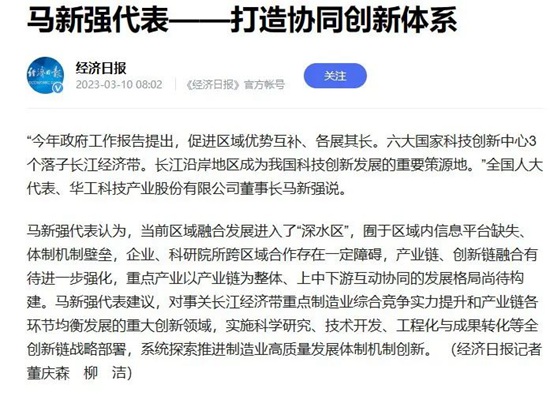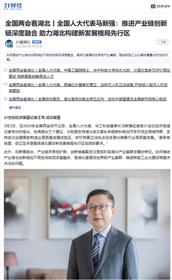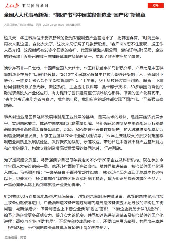 《人民日?qǐng)?bào)》、新華網(wǎng)、央視綜合頻道、中國(guó)國(guó)際電視臺(tái)、21財(cái)經(jīng)、《經(jīng)濟(jì)日?qǐng)?bào)》、《證券時(shí)報(bào)》、《中國(guó)證券報(bào)》、中國(guó)工信產(chǎn)業(yè)網(wǎng)、湖北衛(wèi)視、《湖北日?qǐng)?bào)》、《長(zhǎng)江日?qǐng)?bào)》等多家媒體關(guān)注馬新強(qiáng)代表的履職情況及華工科技創(chuàng)新發(fā)展。