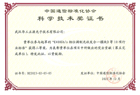 近日,華工正源參與起草的“《400Gb/s相位調(diào)制光收發(fā)合一模塊》等10項(xiàng)行業(yè)標(biāo)準(zhǔn)”獲中國(guó)通信標(biāo)準(zhǔn)化協(xié)會(huì)頒發(fā)的2023年科學(xué)技術(shù)獎(jiǎng)二等獎(jiǎng),進(jìn)一步為算力的高效能、安全穩(wěn)定發(fā)展提供豐富可靠的標(biāo)準(zhǔn)依據(jù)。