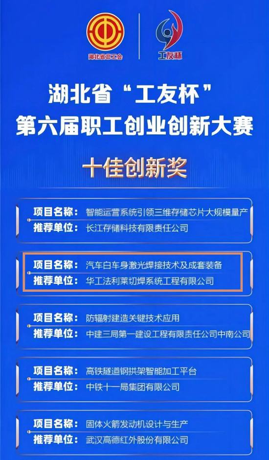 近日,湖北省第六屆“工友杯”職工創(chuàng)業(yè)創(chuàng)新大賽決賽結(jié)束。華工科技核心子公司華工法利萊選送的汽車白車身激光焊接技術(shù)及成套裝備項(xiàng)目,獲“十佳創(chuàng)新獎”第二名。